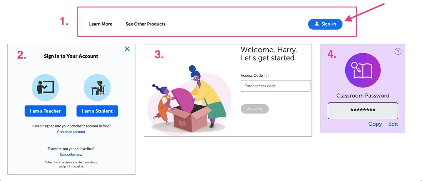 To log in for the first time with your manual account, click "Sign-in" at the top right corner of your magazine's homepage, then choose "Create an account" and follow the onscreen prompts. You will need your one-time Access Code, which you receive with your Teacher's Guide and via email. You must be a current subscriber to access the magazine's online resources.