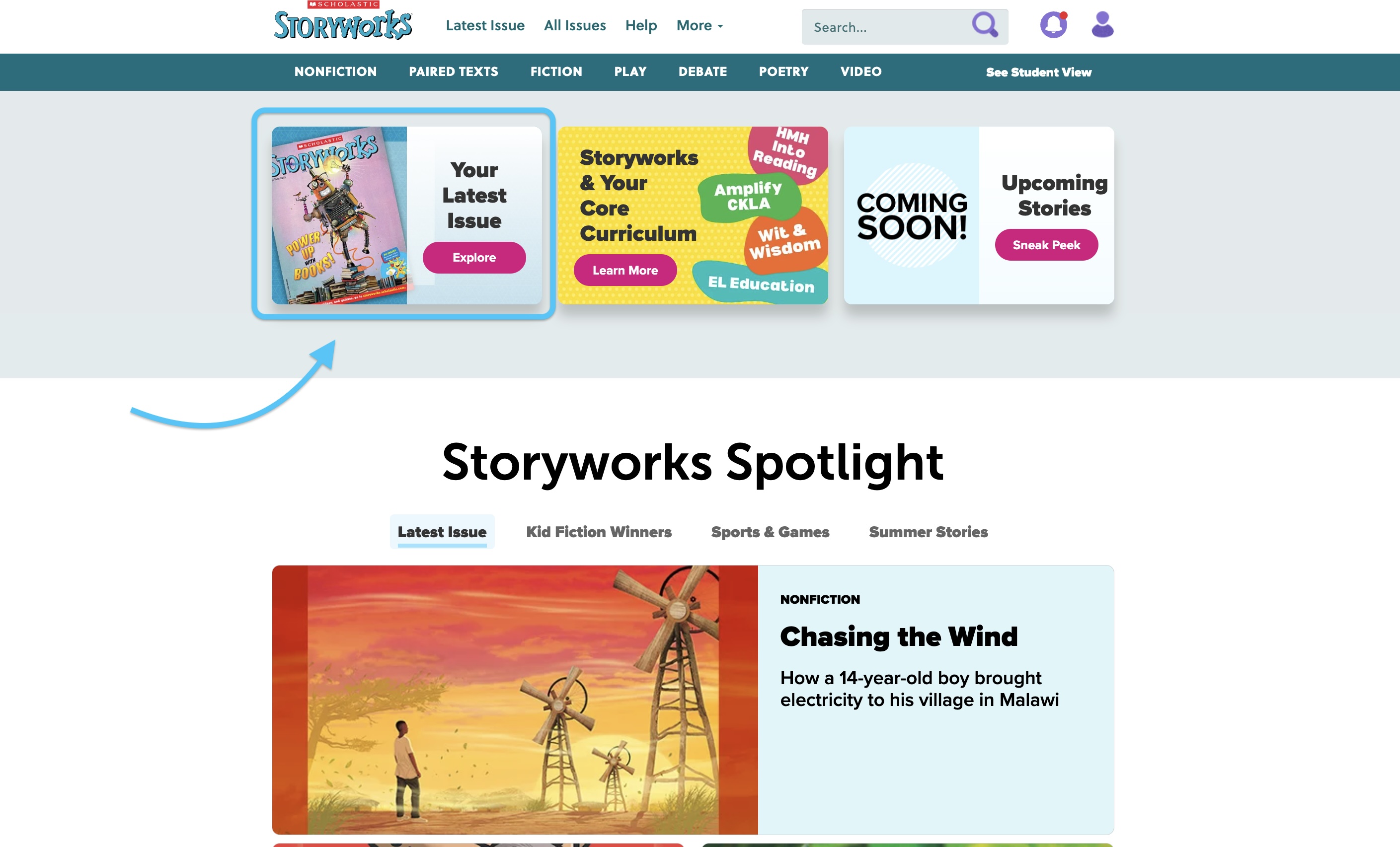 When you log in, you’ll come to your teacher homepage. Your latest issue will always be at the top of the page, just one click away: